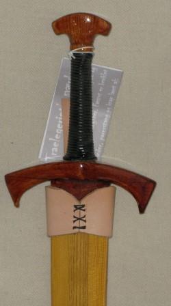 Håndlavet Vikingesværd. Sværdet er 65 cm langt med en klinge på 50 cm. som er 4,5cm på det bredeste sted. Sværdet er bygget op af 3 ligeårede stykker træ. Midterstykket er et langt stykke stærkt løvtræ, som også bruges til redskaber pga. sin styrke. De to sidestykker er af fyrretræ for at sværdet ikke bliver for tungt at holde. Parerstangen er 12 cm lang og lavet af bejdset eg. Knappen er også af bejdset eg. Fæstet (håndtaget) er beviklet med rund lædersnøre af 1,5mm tykkelse. Sværdet kommer med bælteholder i 2mm tyk læder. Sværdet er lakeret minimum 6 gange.